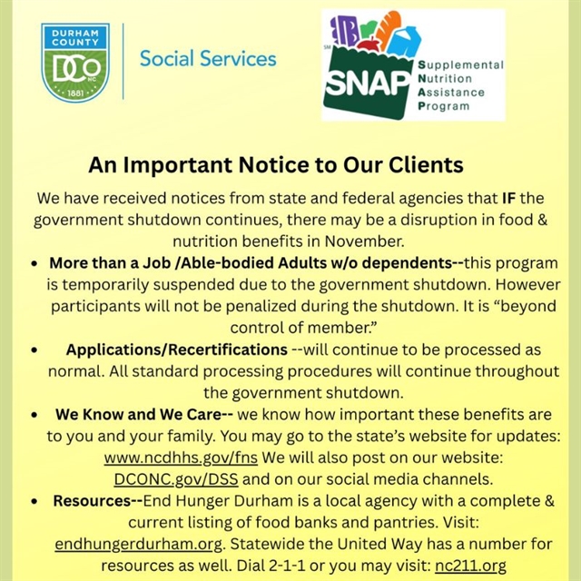 At Durham County Social Services we partner with individuals, families, and the community to help our residents achieve physical, social, and financial well-being. For over a century, our social workers and staff have been serving Durham residents with compassionate care, always with the goal of bettering the lives of those in need.