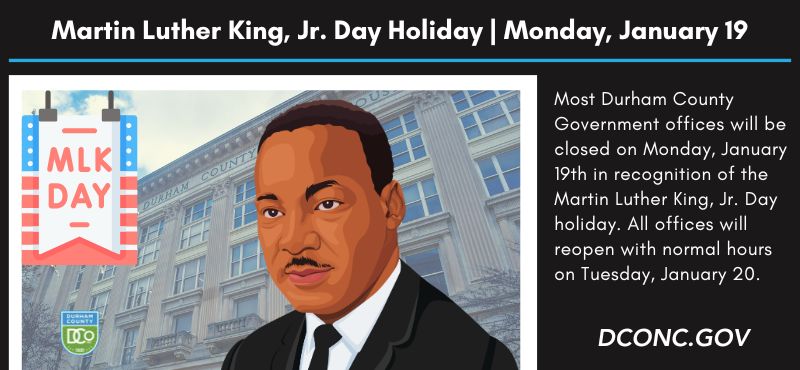 Durham, N.C. – Durham County Government will observe the Martin Luther King, Jr., Day holiday on Monday, January 19, 2026. On this day, most county government offices will be closed. All Durham County offices will reopen with normal hours of operation on Tuesday, January 20.