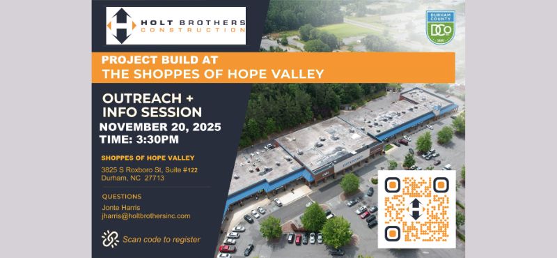 Join the Holt Brothers Construction and Durham County Government team for an outreach and information session for the Project BUILD renovation at the Shoppes of Hope Valley (3825 S. Roxboro Street, Suite 122) on Thursday, November 20 at 3:30 p.m.