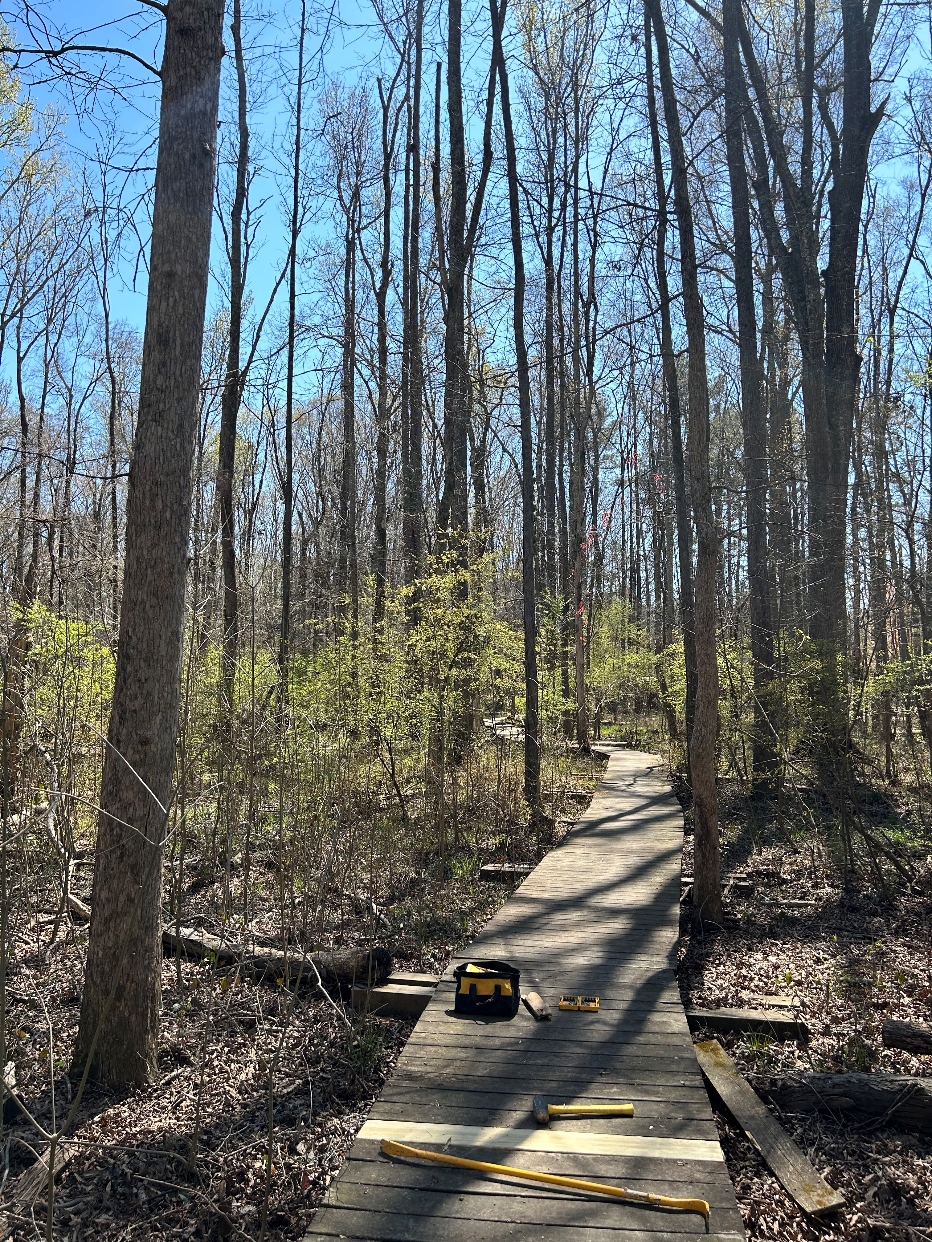 The Open Space Program manages or co-manages four public parks and preserves. Caring for public open spaces requires upkeep of amenities like trails, bridges, and structures, as well as longer-term planning to ensure safe access while protecting a site's natural and cultural resources. As with other types of land management, maintaining amenities for low-impact, nature-based recreation requires a combination of challenging (but often very fun!) manual labor and a thorough understanding of a site's resources. Staff rely on professional expertise and guidelines put forth by land management agencies to design and maintain amenities that minimize impacts to sensitive areas and are resilient in the face of changing environmental conditions. To help protect Durham County's parks and preserves, we ask that visitors practice Leave No Trace principles and adhere to the rules and guidelines listed on the Parks and Preserves page.