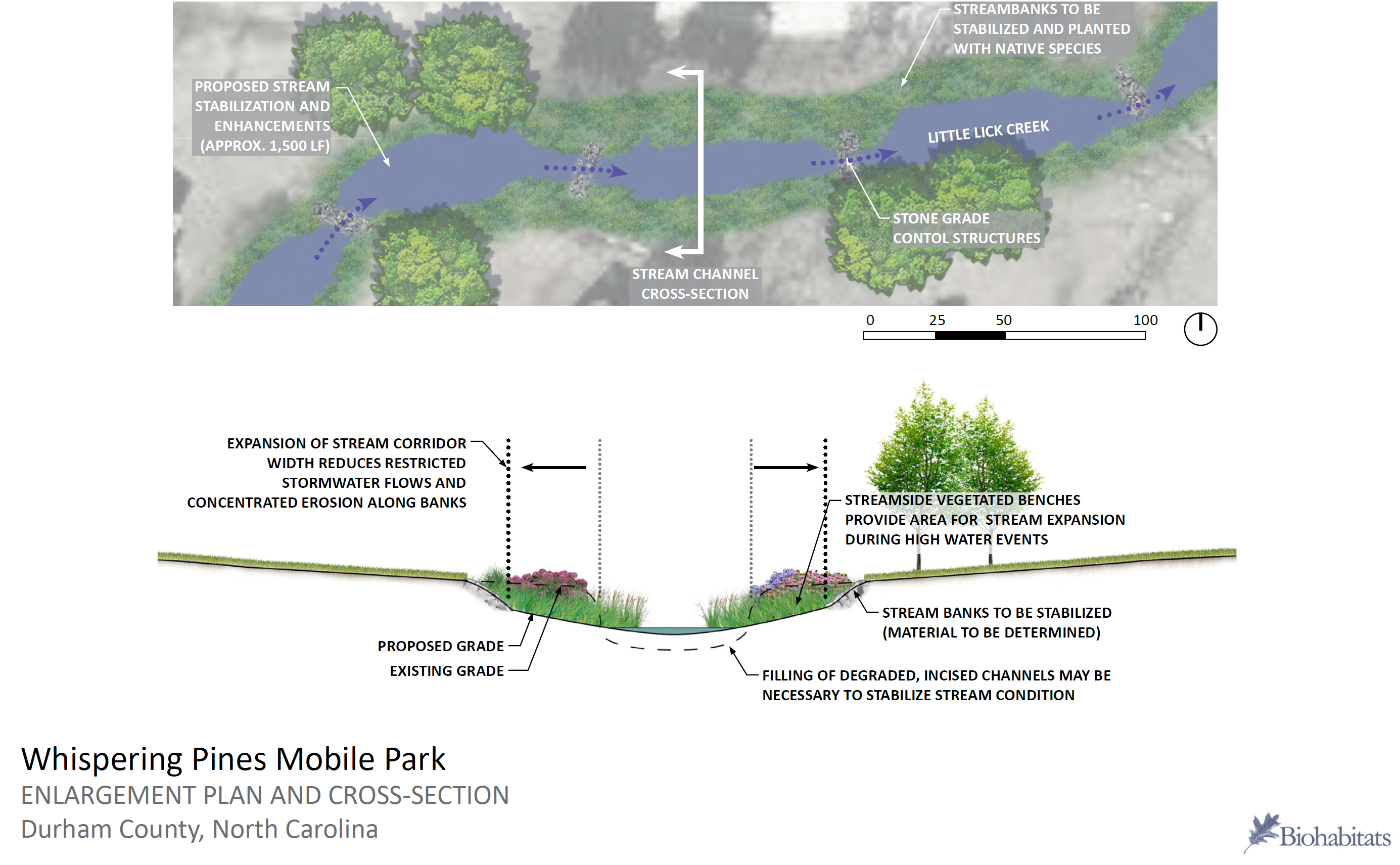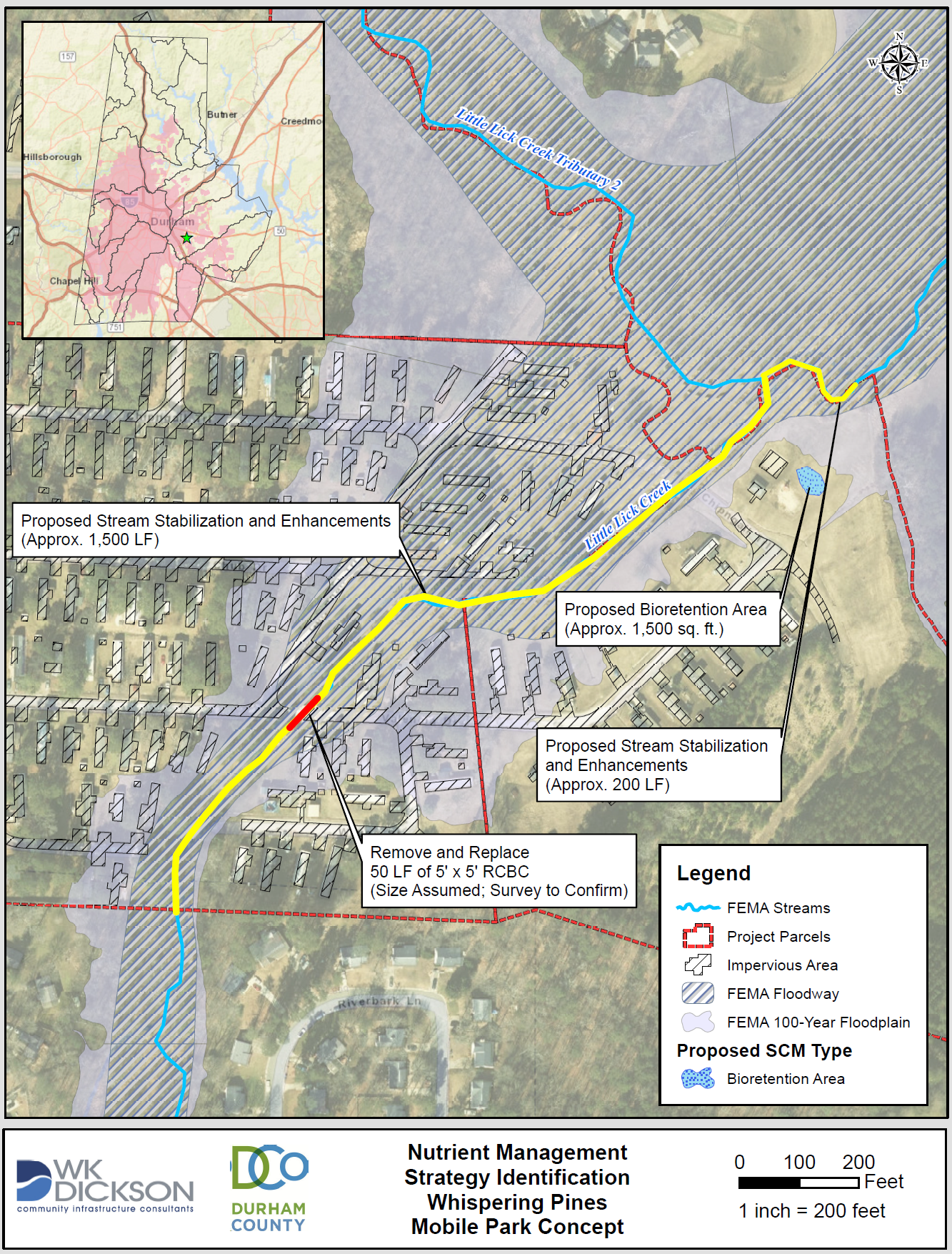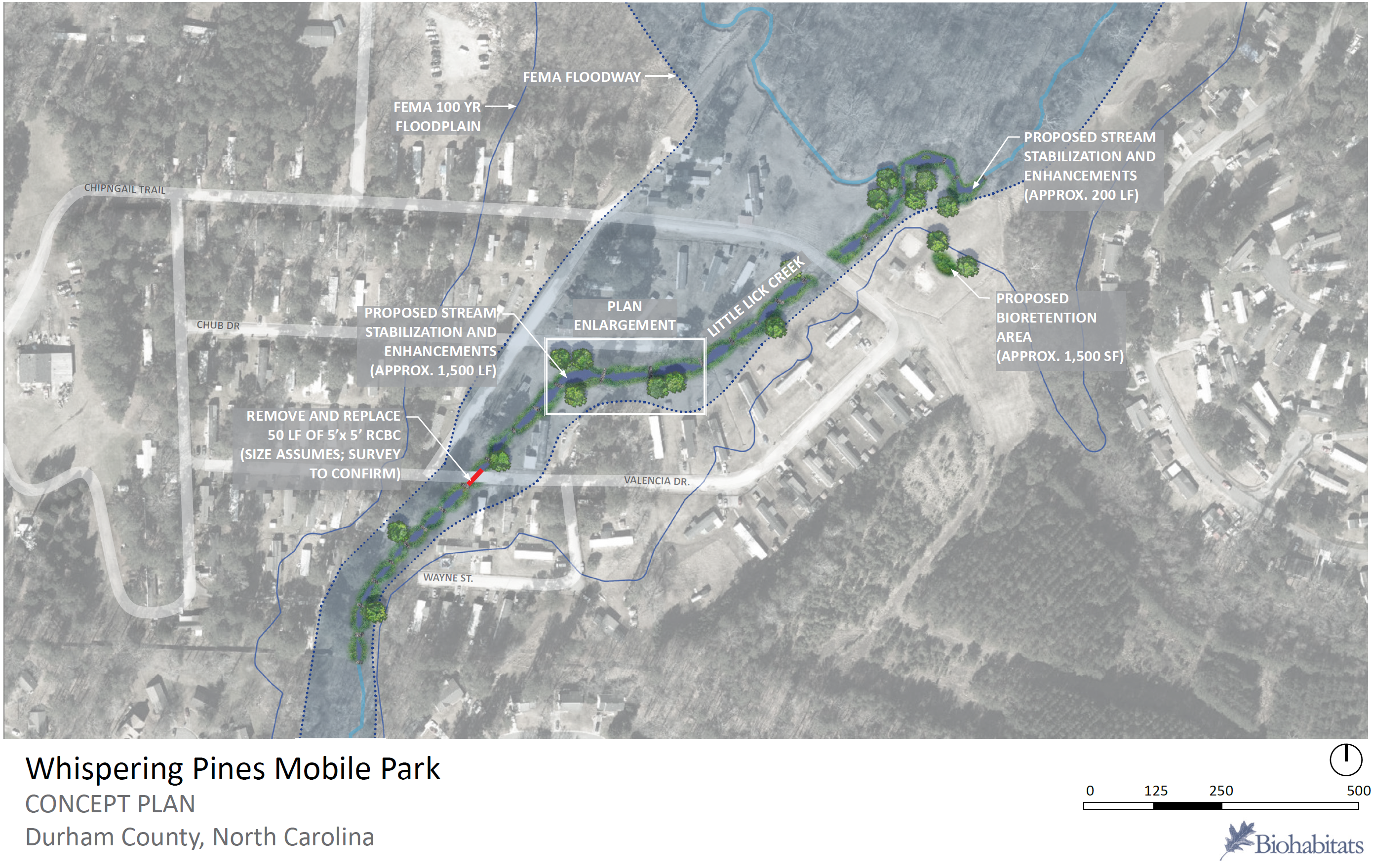 El parque de casas móviles está ubicado en la cuenca de Falls Lake y entre los arroyos “Lick Creek” y “Little Lick Creek”. El sitio del proyecto comprende cuatro acres y contará con la estabilización y restauración de arroyos y un área de jardines de agua/biorretención. El proyecto recolectará la escorrentía de los techos de las casas en el parque al redireccionar el drenaje actual a lo largo de las calles. Este proyecto deberá ayudar a reducir la erosión, la contaminación del agua y a mejorar el flujo de agua en el área.