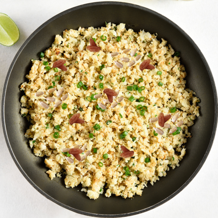 - Use grater to shred raw cauliflower head into bowl (fine blades suggested).