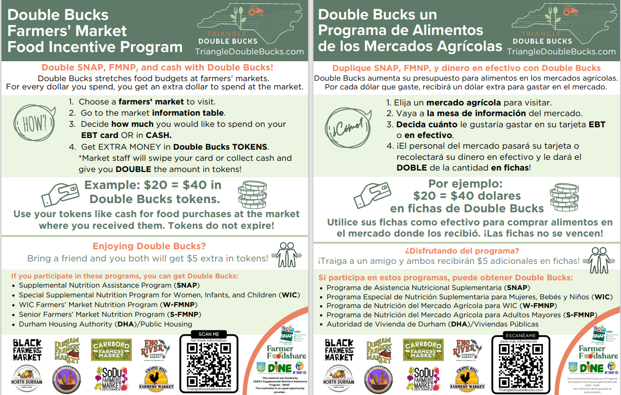 Double Bucks stretches food budgets at farmers' markets. For every dollar you spend, you get an extra dollar to spend at the market.