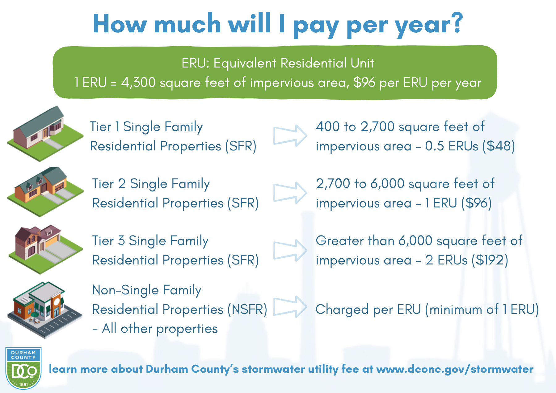 All property owners in Durham County, OUTSIDE of City of Durham limits, who have a property with impervious surface (hard surfaces such as driveway, sidewalk, rooftop) will have the fee added to their property tax bill. All developed parcels, including residential, commercial, industrial, education and agriculture, will be charged. Properties that might be tax-exempt for other purposes (churches, schools, government properties, etc.) will also be billed the stormwater utility fee.