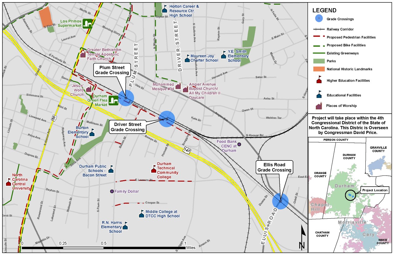 Durham County, in partnership with the City of Durham, the Durham-Chapel Hill-Carrboro Metropolitan Planning Organization, GoTriangle, and the North Carolina Department of Transportation, submitted an application for, and was awarded a grant through the Federal Railroad Administration Railroad Crossing Elimination program for a planning, community engagement, and environmental review project in East Durham. The Durham Rail-crossing Engagement, Planning, and Innovative Revitalization (Durham REPAIR) project will study opportunities for improving safety, mobility, and community near three adjacent railroad crossings, S. Plum Street, S. Driver Street, and Ellis Road. Over the past 25 years, there have been 19 crashes causing three fatalities and nine injuries at these crossings, which are located in a historically disadvantaged area of Durham.